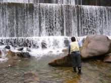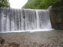 | この後、武ちゃんにも最後に大物を釣ってもらおうと、隣の支流のダムからの最初のえん堤に向かった。用意しておいたロープを使って近道をして河原に降り立った。水量も多く、また爆風で釣りづらいが、両側と真ん中に分かれて三人でそれぞれ竿を出した。しかし、しばらく粘ったがアタリもなく、その下流ではチビイワナが釣れたのみに留まった。そして、今回はここで納竿としたのでした。 |