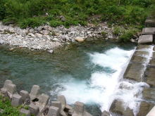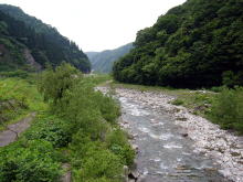 | さてさて、その後、支流へ入ろうかと迷ったのですが、雨も心配だし、支流へ入るには対岸へ渡らなくてはならないので、この増水状態では雨でも降り出したら戻れなくなる恐れもあるので、今回は勇気ある撤退とした。 その後、我々は、8号線に戻り、富山方面へと車を走らせ、次のポイントを模索した。 そして、『ミスターX』の計らいで、いよいよ例のS川での大物への挑戦をさせていただくことになったのです。 現場に着き、軽く腹ごしらえをした。水量は前回よりも少し減っており、濁りも少なくなっていた。 |