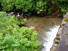 | 意気消沈し、しかたなく移動することにした。 前回に見つけた「どやまらんど」近くのポイントへ行ってみることにした。向かう途中では雨もパラついて来た。黒部でお土産の「ます寿司」を購入していると、私に仕事の電話が掛かってきたので、対応しながらの移動となってしまい、ポイントに入る道が判らなくなり、とんでもない細い道に入ってしまった。車の両サイドに草木が当ってゴリゴリと嫌な音がしている。その間も電話をしていたのであるが気になって電話どころでなかった。だが、何とか見覚えのある場所に出ることが出来てホットした。 しかし、雨が強くなってきたので少し小降りになるのを待ってから竿を出した。前回のポイントを思い出しながら、『ミスターX』に釣ってもらった。 |