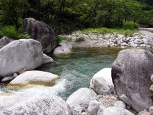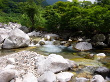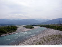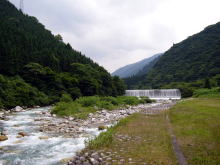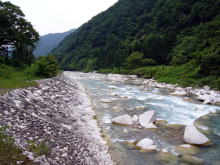 | さて、青海をあとにした我々は久しぶりに「片貝川」を訪れることにした。年に一度は様子を見に行っているのであるが、いつも釣果は少ないが好きな河川の一つである。 黒部に戻り、途中のコンビニで昼食を購入し、途中のキャンプ場へと向かった。途中の取水えん堤で水が取られているので下流域は水量が少ない。だが、えん堤を過ぎると力強い流れが突然現れてくる。 どこまでも澄み切った水は立山連峰の有する保水力のたまものであろう。だが、中流域はこの力強い流れで、中々ポイントがつかめずに、釣りづらい川でもある。 |