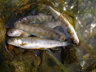 | 【今回の釣果】 【日 時】 2004年6月18日(金)〜 6月19日(土) 【参加者】 つかさくん、隊長。 【天 気】 晴れ 【場 所】 富山県小早月川、片貝川、新潟県青海川 【釣 果】 イワナ 15〜29cm程 二人で16匹弱位かな 【感 想】 今度はみんなで是非来たいですね。 |