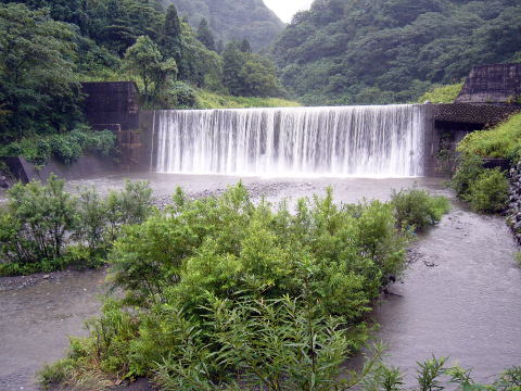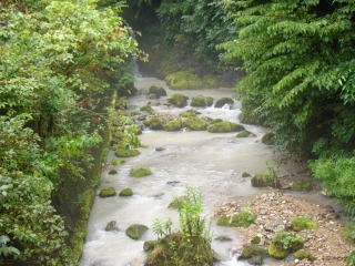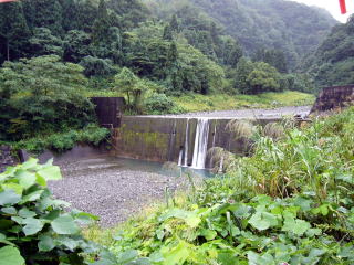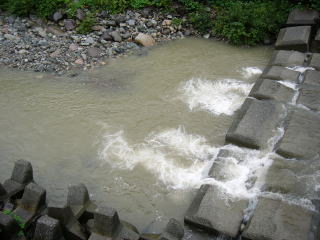 | 二人で並んで竿を出したが、全くアタリが無い。 そして、5〜6分ほど過ぎた時、なんか川の音が大きくなった気がしたので、えん堤を見上げると、先ほどまでの細い流れが、だんだんと広がってきた。 「やばい!!」 すぐに、「つかさくん」に大声で叫んだ。最初はきょとんとしていたつかさくんであったが、が、上流を指差すと、いきなり「鉄砲水だ。逃げろ!!」と叫んだ。 だが、つかさくんは竿をたたもうと仕掛けを巻きだしたので、私は慌てて、「竿は持ったままで逃げよまい」といい、荷物を両手に抱えて取りあえず、高台まで一気に逃げあがったのであった。 そして、後ろを振り返ると、流れはあっと言う間に川幅一杯に広がっていたのである。 |