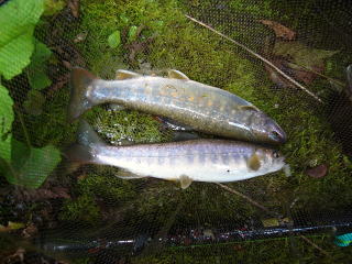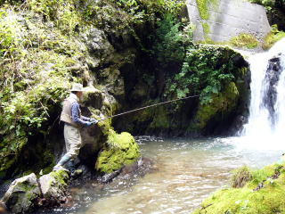 | 泡の中にミミズを投入すると、やっと本日待望のアタリがきた。なぜかこのアタリが懐かしい。引き寄せると20センチ程のイワナちゃんであった。 次も同じポイントを攻めると先ほどよりも少し型のいいイワナが釣れてきた。この後つかさくんもミミズのエサに変えて挑戦したが、アタリが遠のいていった。 釣ったイワナは、お腹に卵を抱えたメスであったので、静かに流れに戻しました。 |