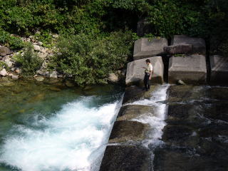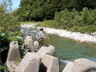 | 「境川に行くよ」と置手紙をして国道8号線に戻る途中、「田海川」をちょっと覗いてみようという事になりました。前回は濁っていて釣りにならなかったのだが、今日は濁りはないが少し水量が少ないようだ。明星セメントの工場前の点在する小えん堤では全くアタリが無かった。 そして、最後の砦の小滝の下へ入ってみた。水量は少ないし、砂で淵も浅くなっていた。最初につかさくんがぶどう虫のエサで攻めてみたが、だめなようだったので私はミミズで挑戦してみた。 |
