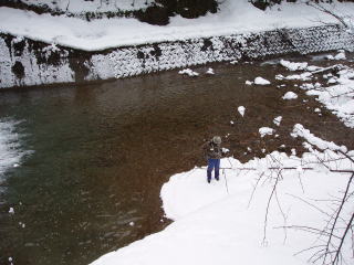 | 次はどこに行こうかと相談し、とりあえず「笹川」へ行ってみた。途中で工事が行われており、濁りがかなり入っていたが、工事場所の上流は大丈夫であったので向かったが、民家を過ぎたところで除雪がしてなく、しかたなく車を置いて歩くことにした。最初のえん堤へは最初につかさくんが無理やり降りた。それを見届けたあとに私も続いておりた。そして、二人で左右から竿を出したが全くアタリが無かった。一旦、道へよじ登り、次のえん堤へと向かったが、積雪が多くて川まで降りられそうになかったのでここも諦めました。今日はもうだめかなと少し諦めぎみです。 |