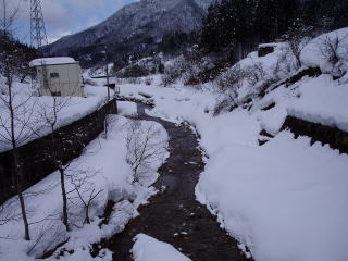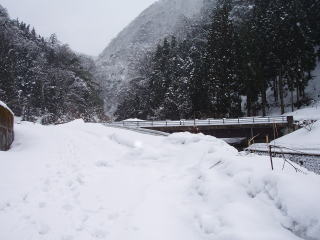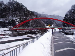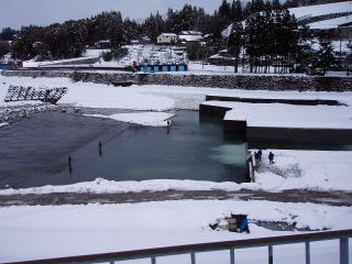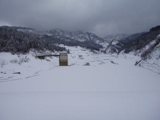 | 愛本橋へ行ってみると釣り人で賑わっていた。解禁前に成魚放流されたようで、監視員の話では朝からかなり釣れているとのことで、「釣るなら券を買ってちょ」とのこと。年券3,500円。日釣り1,500円で、「すぐに5〜6匹は釣れるから元はとれるよ」なんて言っている。 そういえば、昨年とっちん達がここで当日券を購入して指示された所に行ってみると工事で水も流れていなかったと言っていたのを思い出した。それがこの親父かも知れないと思った。しかし、しばらく様子をみていたが一向に釣れる気配が無かったので、引き上げた。 途中で、休憩所を見つけて、昼食をとったがとても寒くて、手がかじかんで中々食べられない。それでも温かいうどんなので体は暖まった。 そして、最後の砦となる「上市川」へ向かった。しかし、上流へ向かうにつれ、凄い積雪量なのだ。道路脇の雪を見ると、何層にも降り積もった様子がよくわかった。やがて「上市ダム」が見えてきたが、ダム湖が全て凍りついておりその様子は圧巻であった。 なんとか第一えん堤に行きたいと思ったが、雪で阻まれた。一台の軽自動車が駐車してあり、崖を無理やり下りた跡が残っており、発電所の噴出し口まで続いているのが見えた。 |