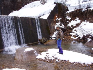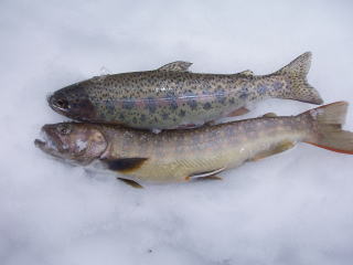| 【本日の釣果】 【日 時】 2005年3月5日(土) 【参加者】 つかさくん、隊長 【天 気】 曇り時々雪 【場 所】 青海川、境川、笹川、上市川 【釣 果】 ニジマス 20センチ1匹 イワナ 23センチ1匹 【感 想】 ちょっと雪が多すぎ!! |