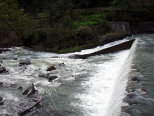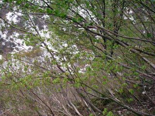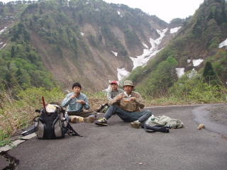 | 青海へ到着後、つかさくんと私は、いつものえん堤へと向かった。 川はやはり雪代でかなり増水しており、いつも竿を出している川の中州へは行けそうにない。 つかさくんがえん堤の脇から竿を出すと言うので、私は下の小えん堤の脇で竿を出すことにした。 仕度をしていると、いきなりつかさくんが戻ってきた。様子がおかしいので、何かあったのと聞くと、行く途中で「ヘビ」がトグロを巻いて睨んでいたので逃げてきたとの事であった。そして、下流へと移動していった。 そして、今度こそ竿を出そうかなと思ったら、ヒスイの監視員のおじさんが現れた。様子をきくと2日程前に大雨が降ったのと、今年は例年の2倍くらいの雪は降ったから、雪代も多いとのことでした。 その後、やっと、竿を出したのだが、さっぱりとアタリが無かった。下流へ向かおうと歩き出すと、私もヘビに遭遇し、遠回りしたのをつかさくんに見られていた。 まあ、そんな事でここを諦めた我々であり、イワナの存在を云々・・なんて以前の問題であったのだ。 車に戻り、下流のえん堤へ降りて見た。とっちんと遅ちゃんの車があったが、姿は無かったので少し待っていると、先ほどのヒスイの監視員のおじさんが上流から降りてきた。どうやら、上流で釣って釣っているのを見かけたようだ。 しばらくして、とっちんと武ちゃんが戻ってきたので様子を聞くが、山道で上流へ行ったが水量が多くて釣りにならなかったとの事であった。遅ちゃん達はまだ戻ってこないようなので、書置きをして田海川へ向かったが、コンビニで、昼食を仕入れている時に、合流できた。 遅ちゃんは、ころんで軽く怪我をしていたが、桐やんに足を掛けられたと、ほざいていたが、桐やんは、遅ちゃんは猿に蹴られたんだなどと言っており、どうでもいいやと思った。 田海川へ行き、途中でとっちんと武ちゃんが竿を出すとの事で、他の4人で先に山超えへと向かった。 道も細くて、途中では山菜採りの車とすれ違うが、なんとかやり過ごす。そしてしばらくゆくと、土砂崩れで 行く手を阻まれた。 地図を取り出して距離を見るが、峠まではまだかなりありそうだ。つかさくんは、歩くぞと張り切っているが、他の3人は思案している。熊も出そうだし、距離もありそうだし・・・。 それでも、つかさくんは行く気満々である。とても足の骨にヒビが入っているとは思えない。そして、まあ行ける所まで行って、だめなら引き返すということで出発した。 |