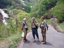 | 昼食後、再び、山菜を物色しながら、戻る途中に事件は起きた。舗装した道路に残った泥に桐やんが足を滑らせて、一瞬体が宙に浮いたかと思ったら、背中から真後ろにバッタリと落ちたのである。そして、桐やんはしばらく動かなかった。 本人は頭を打ったと言っていたが、帽子などに泥が着いていなかったので、打ってはいなかったが。腰などを打ったようだし、首も、むち打ち状態になってようだ。私は昨日も同じように転びそうになったし、フェルト底のシューズは泥に弱いのがよくわかった。 そんな、こんなで、やっと車にたどり着き、とっちんと武ちゃんに合流し、境川へと向かった。 しかし、境川も雪代で釣りにならず、「どやまらんど」近くの里川へ移動。 ここでは、遅ちゃんの一人舞台。 残念ながら、写真は無いが、うけ狙いなのか、合わせミスなのか、大勢のギャラリーの見守る中、何度もバラシを演出してみせてくれ、桐やんも少し痛みが引いたよと言って、笑顔を見せてくれたので、ホッとした。 やがて、雨も振り出してきたので、今日も早めに納竿とした。 |