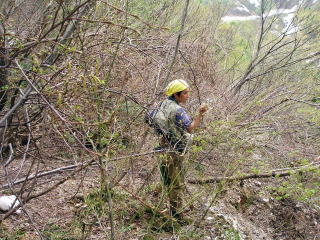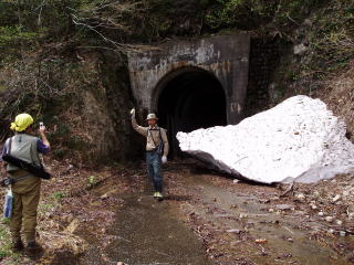 | 途中で、とっちんに電話をすると車を置いたところまで来たとのことであった。山菜を物色しながら、また、地図を見ながら登って行くと、おじさんが山肌で山菜採りをしているのが見えた。 そして、一時間程登ったところで、やっとトンネルが見えてきた。このトンネルを超えて、山道を下ると「田海川」上流のえん堤が現れるはずだ。 |