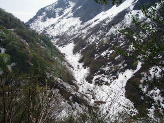 | さて、2日目の5月1日(日曜日)、いつものように、「とっちん」と、「つかさくん」の朝は競ったように早い。しかも、お互いに起きた時間を知っているから、どちらが早く起きたかということで、閑々と朝早くからやっている。だから、他の我々はその声で起きるというのが、ここ「どやまらんど」での常となってしまっている。 どちらでもいいから、もう少し寝かせてと言いたそうに、眠い目をこすりながら、起きてくるのが「武ちゃん」なのだ。そして私はと言うと、「いつまで寝とるんじゃ!!」とつかさくんに布団をはぎ取られ、ビックリして飛び起きて、手すりにしこたま、頭をぶつけて目を覚ますのであった。 そんな、こんなで、さっさと朝食をすませ、7時には、新潟へ向けて出発した。 本日は、「青海川」の様子を探った後、「田海川」の山超えに挑戦する予定である。 思えば、「青海川」は昨年の最後に、全くアタリが無くなって、心配をした。その後に「新潟地震」が発生して、関連も考えたのであるが、今回はその後の様子も確認したいと思う。 今年、最初の釣行では、豪雪で行く手を阻まれて断念したが、すでにその雪も少しを残すのみとなってはいるが、山肌には、まだかなりの残雪が多く残っている。 |