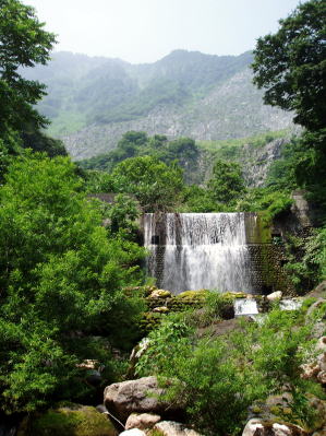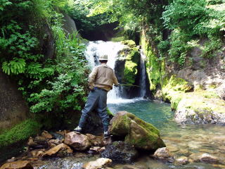 | 気を良くした我々は、イワナを流れに戻した後、この上流のえん堤へ向かった。毎回、来る度に一度入ってみたいと思っていたが、昨年の大雨で道路脇の支流が広がり、そこを利用して先ほどの滝の上流へ出ることに成功したのであった。 到着してビックリ。上流には二段えん堤があり、また、滝の上にも大淵が二箇所もあったのだ。 しかも、あまり人に入った形跡もない。これは、桃源郷の再来かあ!! もう二人の頭の中には、40センチオーバーのイワナを両脇に抱えた写真が、このホームページの見出しにデーンと載っていることを想像しているのであった。 |