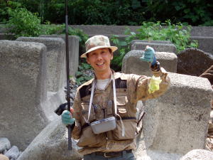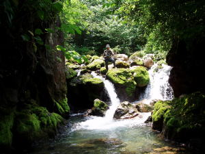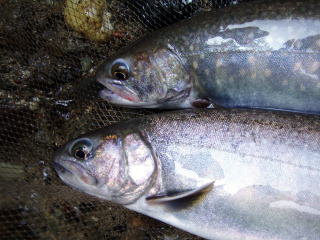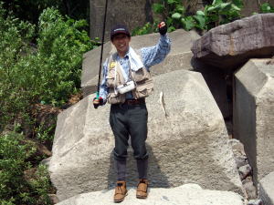 | さてさて、何とか第一次接近遭遇を免れた我々は、となりの田海川へと向かった。 どこも渇水状態なので、狙うのは例の滝くらいしかないということで、春に来た時は水量が多すぎて釣りにならなかったが、今回は期待できる。 ポイントに到着し、様子を見ると絶好の状態であった。川に下りてゆっくりと滝に近づくと、流れ出しのところに門番のチビヤマメが泳いでいるのが見えたので、遠回りをして慎重に近づき竿を出した。 最初は交代で出していたが、一向にアタリが無いので、両側に分かれて二人で釣りだした。それでも、全くアタリがない。 ちょっと飽きてきた私は、先ほどの門番のヤマメでも釣ろうと、つかさくんの足元に仕掛けを投入した。 すると、ググンといきなり強い引きが来た。淵の中へ逃げ込まれないように、慎重に淵の外に引き寄せて何とかタモに納めることが出来た。尺オーバーのイワナで思わず、ニッコリだ。 その後、しばらくして、何と今度はつかさくんの竿が大きくしなった。こいつもかなりでかそうだ。淵尻にまわり、タモですくいあげると、先ほどよりもまた大きいイワナで、二人共ニッコリであった。 |