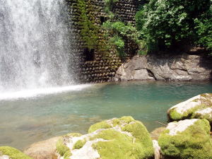 | 最初に一級ポイントと思われるえん堤で、両側から竿を出した。アッという間にアタリがくることを期待したのだが、待てど暮らせど一向に釣れる気配がない、いや、こんなはずはない。二年越しにやっと入れた絶好のポイントのはずなのに・・・。 えん堤を諦めて、順に下流へ下り、ついに滝のすぐ上まで来た。それでも、イワナは顔を見せてくれなかった。おまけに、つかさくんは濡れた岩に足を滑らせて転倒し、水中に落ちた。 これが、次に続く不幸の始まりとは、この時は気づくすべも無かった。 |