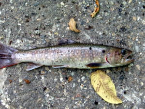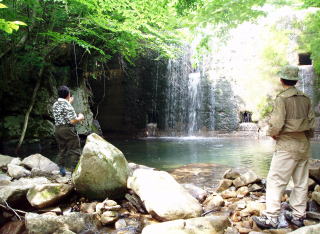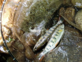 | とっちんは、同じポイントで、再びイワナを釣り上げ、まだいるぞと挑戦していたので、 「それくらいで勘弁してやってよ。」とお願いした。 戻りながら別の川に行ってみることにした。 高山市内に入る前には、とっちんの車の挙動が不自然になり、心配になったのでコンビニに入ると、どうやら居眠りしていたようだった。 昼食を仕入れて、再び41号線を戻り、途中で良さそうなポイントを探して入って見た。 川の名前を見ていなかったが、「小坂」の手前くらいの支流に入った。水量は少ないが、チビアマゴが泳いでいるのが見えた。河原に降りて昼食を済ませ、上流へ行くと小さなえん堤を見つけた。 近くまで寄ると、たくさんのアマゴが群れをなして泳いでいるのが見えた。型は大きくないが、凄い数だ。 |