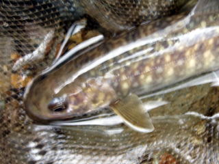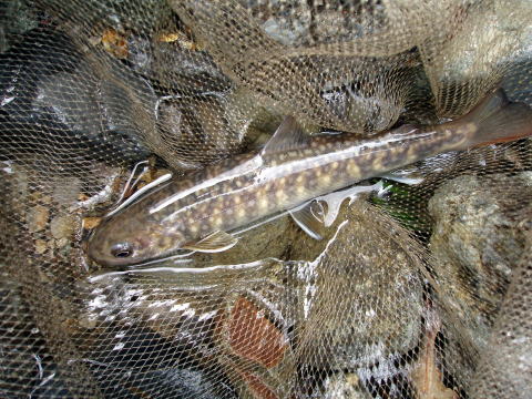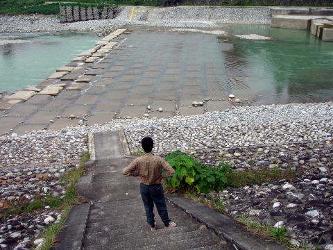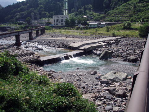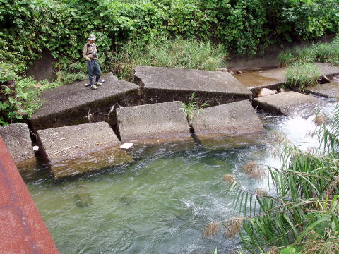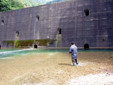 | 最後に「小早月川」へ入ってみた。 入ってすぐの小えん堤を狙ったが、途中で「とっちん」は2回もこけた。また、河原でも一回こけて、ずぶ濡れになった。どうも昨日の疲れが出て、足にきているようだ。 そして、釣果といえば、チビヤマメがここでも連発した。 上流のえん堤へ向かったが、入渓地点の林道が、これまた草木が茂り、入れそうにない。 だが、「とっちん」の 「ええて、ええて、すぐだがや」の声で、つかさくんも泣く泣く車を進めたのであった。 えん堤のプールは、ここも土砂でかなり浅くなっている。両側から釣るが、何とか塩焼きサイズのイワナが私に一匹来たが、あとが続かずに今回はここで納竿とした。 |
