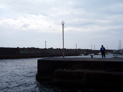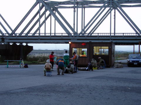 | 雨の合間を見て竿を出すが、すぐに大粒の雨が落ちてくるので、いやになり、午後3時過ぎには諦めて、手取川へ向かった。到着後、川の様子を見ると、昨年とは大違いで、河原にはジャリがひかれており、川幅も狭くなっている。また、サケの背びれも多く見られ、昨年よりも遡上は多いようだ。 近所の釣具屋に寄って様子を聞いて見ると、毎日100匹以上は上がっており、河原は今年の大雨で土手が崩れ、流れてきた土砂も整備して今の状態になったようである。 アオリイカをまだ諦めきれない「とっちん」が金沢港まで行くと言うので向かいましたが、結局、雨や風も収まらずに夕食を取っただけで、再び戻ることにした。 途中の「松任」で温泉に入り、明日への鋭気を養う。その後、コンビニで食料やビールを買い込み、手取川横の駐車場へ戻りました。この後は恒例の酒盛りをしながら、ルアーの準備や釣り談義をした後に早めに就寝となりました。でも、夜中には雨と風で何回も目が覚めてしまいました。 目が覚めたのは朝6時頃かな。既にたくさんの車が集まっており、その中に「桐やん」の車を見つけたので、挨拶に向かう。2時前には到着したようだったが、全然気がつかなかった。 既に管理棟の前には、釣り人が並び始めている。釣れ始めるのは8時過ぎ位だから慌てることもないよと、とっちんが言っているので、まあいいかと思い、ゆっくりと腹ごしらえをしてから受付を済ませ、準備に取り掛かる。 受付は6時45分開始で、昨年などは早い人は釣り上げたサケを持ってくるのを見かけたものだが、今年は30分たっても、誰もこない。 |