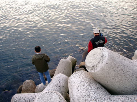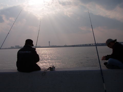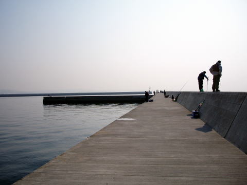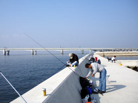 | 待てど、暮らせど、一向にアタリが来ません。遂にクーラーから缶ビールを出し飲み始めました。 しばらくして、隣で釣っていた小学生が良型のメバルを釣り上げたので、頑張ったのですが全然ダメ。大須賀さんは居眠りを始める始末である。そして、加古さんが小振りのメバルを釣り上げた所で、お昼休憩とした。ここはフェリー乗り場が近いのでトイレや食事には困らない。後は魚だけなのだが・・・・。 置き竿にしたエサもそのまま残っているし、全くアタリもなく、周りの釣り人も帰り始めた。そして我々も場所を変えることにしたのであった。 |