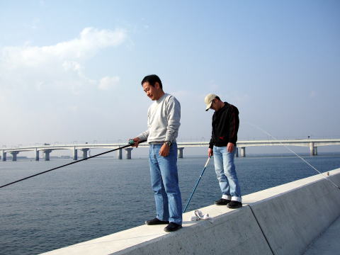 | 11月27日(日)、またまた知多へ釣りに出掛けてしまいました。 満潮はお昼頃だったので今回はゆっくりと家を出て、加古さん家で、大須賀さんと合流し3人で出発しました。 今回は、セントレア空港の向かいにある「セントレア前島」で、ちょうどフェリー乗り場の前に陣取り、釣り始めました。先週とは違い、風もなく暖かい日和でのんびりとできました。 ほんとうは「アイナメ」狙いということだったんですが、周りの人をみてもあまり釣れていません。とりあえず今回新調した投げ竿にエサを付けて遠投し、そのまま置き竿にした。 その間に、堤防下のメバル等を探りました。 |