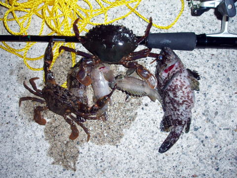 | 【今回の釣果】 参加者:加古さん、大須賀さん、隊長。 日時: 2005年11月27日(日) 天気: 晴れ 場所: 常滑市セントレア前島・鬼崎漁港 釣果:メバルとカニ? |