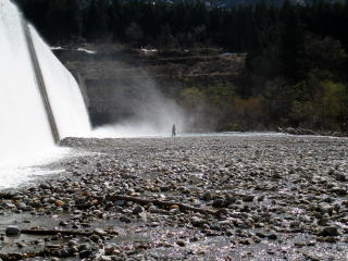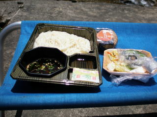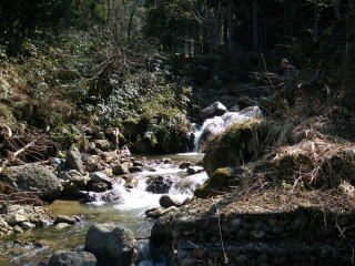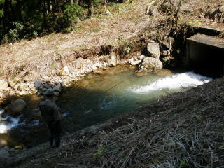 | 白岩川を後にした根こそぎ隊は、次の獲物を「小早月川」へと定めた。 滑川の「早月川」を横切り、箕輪で左折すると、小さなトンネルがある。それを抜けると小早月川が見えてくる。雪代がかなり入っており水量は多めである。いつものように「いわなや」の横を通ると犬が駆け寄って来る。それも無視してどんどんと林道をひた走る。地元の山菜取りの車とよくすれ違うのもこの時期である。 だが、途中まで行ったところで、がけ崩れで奥に行けなくなってしまった。車幅いっぱいの道路ではユーターンもできず、バックするはめになってしまった。一旦、下流へ戻り、途中のえん堤で昼食をとりながら釣りを楽しむことにした。 えん堤の横の広場で、缶ビールを飲みながら弁当を頬張る。春のそよ風が心地よく、至福の時をしばらく楽しんだのであった。 |