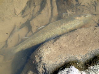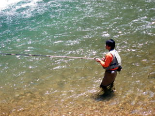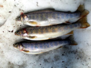 | そんなことより、釣り、釣り。それぞれに分かれてしばらく釣りを楽しみました。私とつかさくんは上流へと向かいましたが、途中、道路の残雪で行く手を阻まれるが、これはランクルの恩恵に預り、積もった雪を4〜5回で踏み固めて撃破した。(本当はセンターデフロックを忘れていており、4〜5回もかかったようです(つかさくん後日談)。 これを過ぎると、道路横に好ポイントが現れてきた。さっそく車を止めて釣り始める。半年振りの渓流釣りで、いつもそうなのだが、第一投目は手もとが落ち着かない、だがやがて感じるであろう魚信の感覚にわくわくするものだ。 道路を挟んだポイントに別れて竿を出すことにした。つかさくんは上流へ行き、私は下流の落ち込みへと向かった。丘の上から竿を出しながら、そっと川の中を見るとイワナの影を見つけた。 仕掛けがそのポイントに入るとググッとした心地よい引きが竿に伝わってきた。23センチ程の丸々と太ったイワナで、慎重にタモに収めると、久ぶりの感触に思わず顔がほころんだ。 その後すぐ下のポイントへ移動し、白泡の中に仕掛けを投入すると、しばらくして強い引きがあり、今度は25センチ近いイワナが竿をしならせてくれた。つかさくんが戻ってきたので、ポイントを譲り、先ほどのポイントに戻って竿をだすと、もう一匹良型のイワナが釣れてきた。 ここでは私に3匹の良型イワナがきたが、つかさくんはトグロをまいたヘビに遭遇したようで、意気消沈していた。しばらく楽しんだ後、集合地点に戻るとみんなポツポツと釣れたようで、今晩のおかずはゲットできたようだ。 |