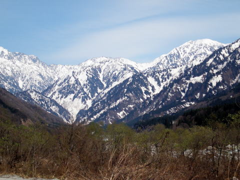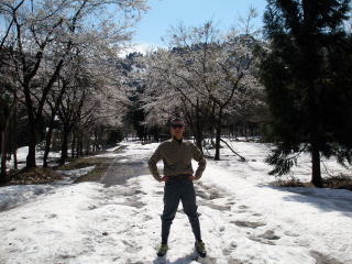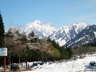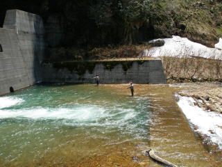 | 今度は、早月川の本流へと車を進めた。 剣岳の登山口へと続く道路には雪がしっかりと残っており、登山者の物と思われる車が道横に一列となってたくさん続いていた。満開となった桜の木の下にも雪が残っていて、優雅な景色をかもし出している。 河原へと続く道路も例外ではなく、車で降りることができないので歩くことにしたのであるが、少し歩き始めてえん堤が見えてきた時、その距離を見て全員がすぐに撤退に賛成した。一昔前なら、我先にすっとんで行き、競争で竿を出したものであるが、残念ながら、今はその面影もない。 とっちんなどは、そんな空気を知っていたかのように、戻ってみると、まだ車の横で仕掛けの準備をしていたところであった。 ふと向こう岸を見ると、えん堤横を走る車を発見。ただちに直行したのは言うまでもない。 連休とあって釣り人も多い。ここは渓流釣りを始めた頃に時々訪れていたが、その時は良型のイワナがたくさん釣れて上流の「馬場島キャンプ場」で楽しんだものであるが、今はその面影もなく、だんだんと足が遠のいていた。やはり今回もえん堤ではアタリも無かった。ただ「桐やん」は、小振りのイワナがヒットしたようであった。 |