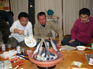 | 時間も午後3時を過ぎた。本日の納竿タイムである。前日は余り寝ていないので、早めに宿に行くことにした。 2〜3年前なら、黒部に着けば本流などを狙い、暗くなるまで竿を出していたのであるが、隊員のみんなも歳をとった証拠かも知れないって、去年も同じこと言っていたような気がするなあ。 それでも、スーパーでの買出しを終えて、荷物を解くと、とっちんやひろくん・武ちゃん達は今晩のおかずが足らないと言って、近くの尺物ポイントへ釣りに出掛けて行きました。 宿でびっくりしたのは、バンガローの中が「カメムシ」と「テントウムシ」の大群で占拠されており、浴室などは、見るのも気持ち悪いくらいで、その掃除だけでもかなりの時間を費やした。片付けも一段落し、隣にある「明日温泉(あけびおんせん)」に行き、疲れを癒した。 今年も豪華な夕食となり、イワナの塩焼きは言うに及ばず、今回の締めはとっちんが自前の蕎麦打ちで、ざる蕎麦を美味しく頂きました。食後は焼酎を飲みながら、ぐだぐだと過ごす。これも楽しみの一つなのです。 その後は、眠たくなった人から順に、ふとんにもぐりこむのです。ちなみに私は最初だったかも。 |