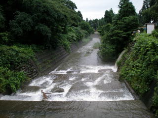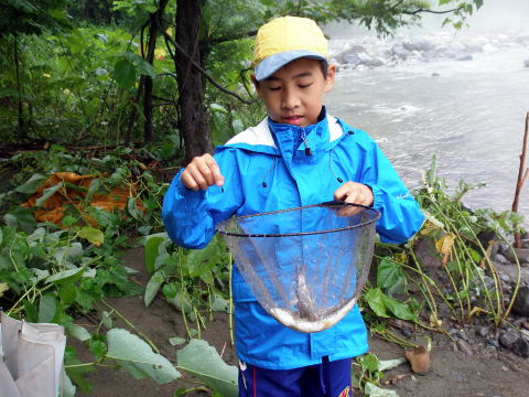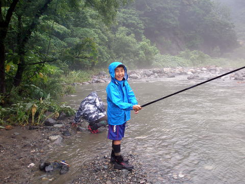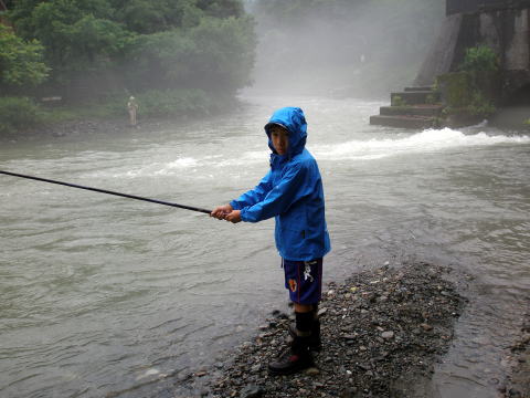 | なんとか、しんくんが釣れたのでホッしたが、とっちんはまだ釣れていないので何とか一匹でも釣りたいとのことで、次に「境川」を覗いてみた。 だが、ここもやはり濁流状態だ。しかたなく上流の支流へ向かった。激しい雨の中、執念で竿を出すとっちんは、橋の上から挑戦し、何とか待望の一匹を釣り上げた。 だが、アタリは強かったものの、「お魚ちゃん」があまりにも小さかったためか、哀れにも「お魚ちゃん」はものすごい勢いで空高く舞っていました。それを後ろで見ていた我々は大笑いで、釣り上げたとっちんも何が起こったのかとビックリしていました。 この後、支流の奥のえん堤へ入って行ったとっちんであったが、水飛沫が強くてびっしょりになってすぐに戻ってきたのでした。 まだ時間は午後12過ぎ。雨も酷くて一旦、宿に向かうことにした。途中でしんくんがおかあさんに電話を入れた時、富山地方に「大雨洪水警報」が出ているのを始めて知ったのでした。 また、しんくんは魚が釣れたことを嬉しそうに報告をしていたが、お父さんは?と聞かれた時、 「流れていったよ」なんて言っていたのでした。 |