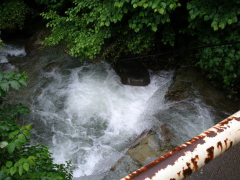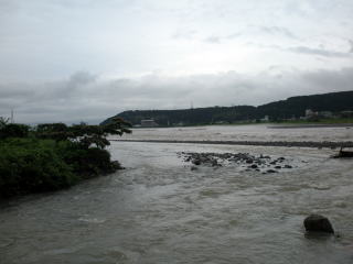 | 支流の「倉谷川」を覗いてみると少しは濁りが少なかったので、とっちんとしんくんが竿を出してみた。 幸い、雨も小降りになっていたので良かったのだが、アタリが全然なかったようだ。 少し上流へと向かってみたがこれっといっていいポイントも見つからずに、山超えをして「姫川」の上流へ向かうことにした。 峠付近では、雲の上なのか雨も上がっていたが、姫川に到着するとやはり凄い状態になっていた。 しかたなく、支流を探してポイントを探るが全くアタリがなかった。 |