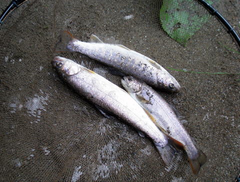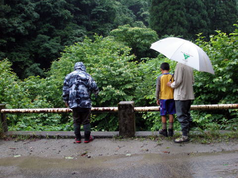 | だんだんと拙い状態になってきた。雨も大降りになってきたし、釣れるポイントも全くない。 これでは久々の「しんくん」のご機嫌を損ねてしまうことになる。そう思いながら後部座席のしんくんを見ると「PSP」のゲームに夢中になっていた。 しかたない、こうなったら最後の望みの綱で、宿の「どやまらんど」近くの里川へ向かうことにした。 国道8号線を富山へ向かって車を進める。途中で来る時に見た「青海川」に架かる橋を渡った時、水量も少し減っており、濁りも少なくなっているように見えた。 急遽ユーターンし、発電所まで入ってみた。たぶん上流のダムや取水口で水量を調整しているのだと思う。 だが、雨は激しくなる一方だ。反対岸を見るとフライマンが一人竿を出しているのが見えた。 このまま待っていても再び、濁りは増してくるはずなので、雨合羽を着て、無理やり竿を出すことにした。 幸い、ダムの流れ出しの所は水量も少ないので、みんなが見守る中、しんくんが竿を出した。 絶好ポイントへ何度も仕掛けを流すが、アタリが無いようだ。 後ろで見ていた私は、しんくんの横で並んで竿を出し始めた。するといきなりググッとしたアタリがあり、慎重に引き寄せてタモに収めると、良型のイワナが釣れてきた。 どうも流れの緩い場所にいるようである。さっそくしんくんにポイントを譲り見守る。 すると、来ました、来ました、待望の一匹が釣れました。 見守っていた我々も一安心です。なによりつかさくんもホッとした様子でした。その後も粘るしんくんは、もう一匹を追加した。横で流れ出しを狙っていた私には結局アタリが無かった。 しんくんは、ポツポツとアタリがあるようで、エサを変えながら粘ってる。だが、雨も激しくなってきたので移動することにした。 とっちんが、しんくんに「今晩これ食べる?」って聞いていたが、しんくんは釣ったイワナ達をゆっくりと流れの中に戻しており、私も思わず心が温まる思いであった。 |