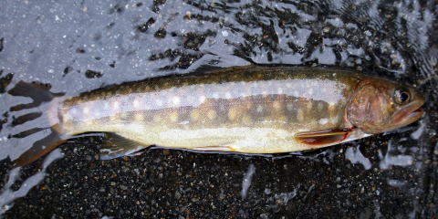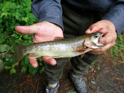 | 結局、ここは諦めて荘川へと向かったのであった。 国道41号線で高山へ向かい、途中の飛騨古川から、飛騨清美インターへと向かった。 以前から少し気になってはいたが、通る機会がなく、新しい川も探す意味もあって、初めて通ってみた。 途中までは、狭い道で少し走りにくいが、峠を越えたとたんに広くなってきれいな道路となった。 「飛騨卯の花街道」と看板がでており、猪臥山トンネルという長いトンネルを抜けると、きれいな川が見えてきた。 「彦谷の里」と呼ばれている地区で、別荘などが並んでいる。途中で管理棟へ寄って話しを聞くと、放流もされているようだ。普段の水量がよく判らないが、キャンプ場も整備されており、機会があれば来てみようと思う。 国道156号線に出て荘川の支流を探る。川の名前までは判らなかったが、待望の一匹がやっととっちんに出た。しかも良型のイワナであり、とっちんもニッコリしていた。 |