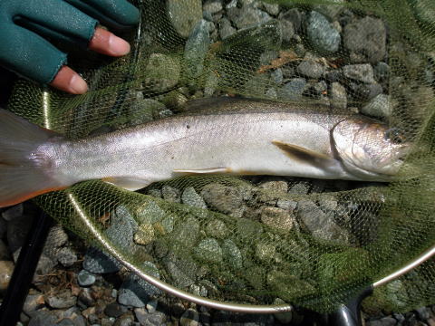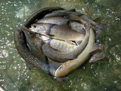 | 翌朝の午前5時半、気合でつかさくんに起こしてもらった。 元気があるのは初日だけなので、朝マズメを釣らないでどうするんだ、てな具合である。 もちろん早起きの「とっちん」も起きており、美味しいコーヒーをご馳走になり軽く朝食を済ませた。 まだ他の人は寝ていたので、二人での出発となった。 ETC早朝割引を使い、高速で親不知インターで降り、「青海川」へと直行した。 今年は雪も少なかったようで、いつもより雪代も少ないようだが、いつもの第二えん堤は飛沫が強そうだが、久しぶりの青海で、はやる気持ちを抑えながら釣り始めた。 最初につかさくんがえん堤の右がわで釣っていたが、アタリが無いようなので私のその横で竿を出した。すると第一投目から27〜8センチのイワナが釣れてきてビックリした。 数年前の新潟地震の前には一匹も居なくなった(釣れなくなった)記憶があり、今年は能登地震もあったので心配をしていたのだが、これで一安心した。 ポイントをつかさくんに譲り、飛沫の中を対岸に渡り再び竿を出すと続けて2匹の良方イワナが釣れてきた。また、つかさくんにも来たようだ。 アタリが遠のいたので少し休憩していると下のえん堤からつかさくんが良型イワナを抜き上げたので、 移動することにした。 えん堤の落込みで粘っていたが、釣り難いので下流の淵の泡の中へ仕掛けを入れると、いきなりガツンと大きなアタリが来た。これはデカイ!!何とか持ちこたえてタモを出した途端に再び流れの中に逃げ込まれてしまった。糸も昨年のままなので少し心配になったが、何とか再び引き寄せることができて今度はしっかりとタモに収めることができました。 その後、同じポイントで2匹程良型をバラシたが、何とかもう2匹を追加した。 つかさくんもえん堤の落込みで入れ食い状態となっている。二人で10匹以上は釣っただろうか、時間はまだ11時前だが、明日しんくんやとしくん達も来るので、ここで納竿とした。 |