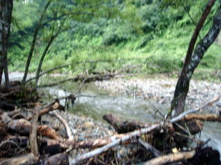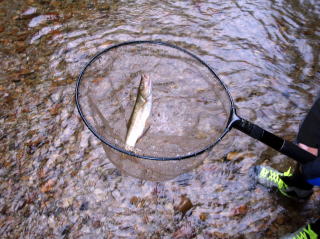 | 時間短縮の為、昼食はコンビニの弁当で済ませ、「ひろくん」からの情報に従い、まず途中の「伊藤釣具店」へ立ち寄って様子を聞いてみた。おばあさんの話では「和賀川」はどんなに雨が降っても濁らないし、うちの「ブドウ虫」じゃないと釣れないよなどと言っていた。話が長くなりそうだったので、とりあえず日釣り券を購入し、「西和賀川」へ向かった。 入渓地点を探していると地元の人が通りかかったので尋ねてみた。しかし、言葉がよく判らず、とにかく上流へはその車では無理だし、クマもたくさんいるから止めとけと言っているようだったので、本命の「和賀川」へと移動した。 本流は前日の雨のせいか、かなり濁りが入っていたので上流を目指す。そして和賀川の支流の「高下川」に入ることにした。(ひろくんお勧めの大物イワナの第一級ポイントらしい) 一旦上流へ行き、そこから釣り下ることにし、遅ちゃんには途中まで車で戻って待機してもらった。 水量も少なくてチャラ瀬の連続だ。所々で竿を出すも全くアタリも無い。しばらく下ると大堰堤の上に出てしまった。雨も降ってきたので道路に戻ろうと崖を必死でよじ登り、小高い場所に出たが道路は全く見えない。しかたなく先ほどの大堰堤まで戻り、これまた必死で高巻きをして何とか堰堤の下に降り立った。 よく見ると絶好のポイントだ。時間も無いので直ぐに釣り始めた。するとつかさくんの竿が直ぐに弧を描いた。 タモを準備して魚を取り込んであげたが、それを見てビックリ。遅ちゃんのお友達がここまで付いてきていたのだ。 つかさくんに判らないようにリリースしようと思ったが、案の定見つかってしまい、その憤懣たるや・・・・。 次に私も竿を出して見たが、結果は同じ。そして何とか気を取り直したつかさくんにも再び・・・・。暗くなってきたのでここで納竿とした。 ここから、雫石方面へと向かい、田沢湖高原温泉の「プラザホテル山麓荘」に到着したのは午後7時を過ぎた頃であった。 |
