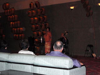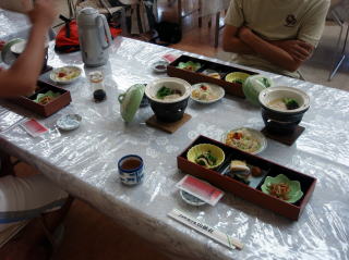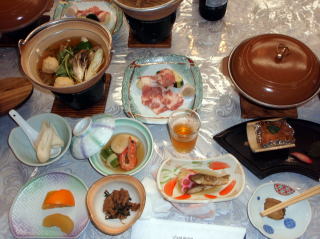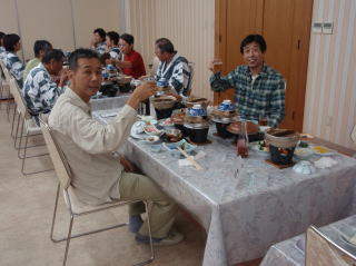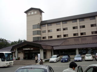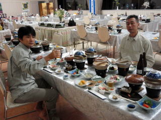 | さてさてホテルに到着後、腹ペコの隊員達は、お風呂の前に腹ごしらえとした。夕食は「きりたんぽ鍋」などの地元の料理がたくさん出て、地ビールと共に美味しく頂きました。炊き込みご飯も美味しかったが、白いご飯はお代わり自由と聞き、つかさくんは「わんこそば」に備え何杯もお代わりをし、胃を大きくしておくのだと言っていた。(実際に何杯食べたかは数え切れませんでした。) また、ロビーでは「津軽三味線」の演奏や民謡のショーが行われて、ここでやっと東北に来たのだなあと実感した。 なんせ飛行機でほんの一時間足らずでついてしまったので、車で走っているときはあまり感じられなかったのだ。 その後は露天風呂や大浴場へ行き、温泉をじっくりと楽しみ眠りに付きました。 |