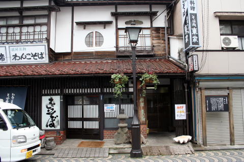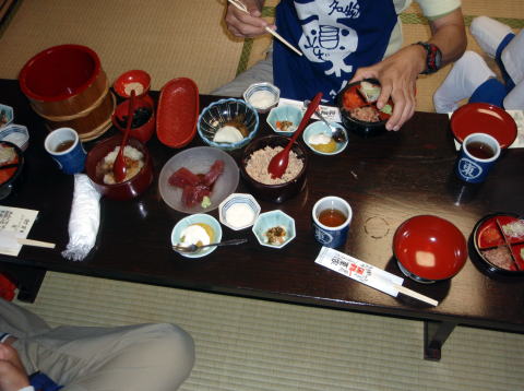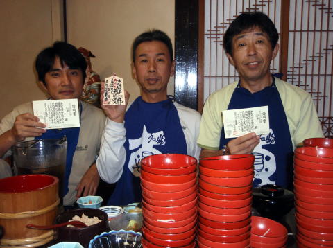 | さてさて、お祭りの見学も一息ついたところで開店の時間となった。 「東屋」さんに行くと、既に何人かが店の開店を待っていた。その列に加わり店の中に入った。 わんこそばの人は2階の広間に案内され、店の人から説明を受けた。わんこそばのメニューは三種類程あり、2,600円と3,100円とあと4,000円だったかな。 目の前に食べた「お椀」を積上げてくれるのが3,100円で、ちょっと高いが折角なのでそのコースを全員注文した。 最初に具や、刺身などが運ばれてきた。そして前掛けまで渡されました。 お腹一杯でもう無理な時はふたをして下さいと説明を受けた。 スタートし、全員一斉に給仕のお姉さんの掛け声で食べ始める。毎回中身の量が少し違っている。少ない時はちょっとホッとするが、多い時は・・・。 そして10杯、20杯とお椀が積上げられて行きました。 お姉さん「あ〜、どんどん。」とか、「あ〜よいしょ」などと言いながら、どんどんお代わりを進めてくる。 もうちょっとゆっくり食べたかったのだが、次のお椀を持って、早く食べてと待ち構えている。 私は30杯を越えた所で、う〜ん、苦しい。朝ごはんをいつも以上に食べたのが効いた。 遂に33杯目で終了としたが、遅ちゃんは、いつものように噛まずに飲み込む食べ方が功を奏し、50杯までいった。 つかさくんは、「もう苦しい」と言い出した時は60杯を越えた所だった。 その時、お姉さんの「100杯」を越えると記念品が貰えますよ。という一言で、つかさくんの闘志に火が点いた。 苦しみながらも90杯を軽く越えた時、今何杯目とお姉さんに聞くが返事はして貰えない。 100杯を越えた時にやっと教えてもらったので、ふたをしようと思っても箸を持っているのでうまくふたが閉まらずに、とうとう103杯までいって何とか終了したのであった。 |
