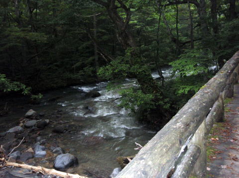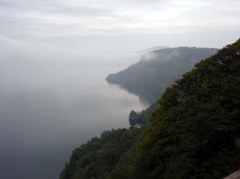 | 9月15日土曜日、遂に最終日となってしまいました。 朝5時に起き、「奥入瀬渓流」の散策に出掛けた。しかし、曇っていて薄暗いのと水量が少なくて全くといっていいほど見所が見つけられなかった。 また、あちこちに台風の爪痕も残っており流木などが散乱していた。 途中では竿を出している人もちらほらと見え、ここは釣ってもいいいんだということが判りました。 ついでに展望台まで行って見たが、十和田湖も靄に包まれていて余り見えなかった。 しかたがないので、ここで諦めホテルに戻った。 |