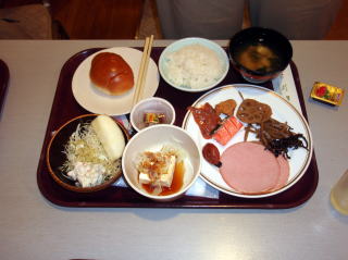 | ホテルに戻り、朝食とした。食事はバイキングで食べ放題である。 だが、全員少な目だ。なぜなら今日は盛岡で「わんこそば」に挑戦するのである。 不覚にも、私は納豆掛けご飯を二杯もたべてしまった。まあいいか。 そして、8時半前にはチェックアウトし、一路「盛岡市」へと向かった。 |