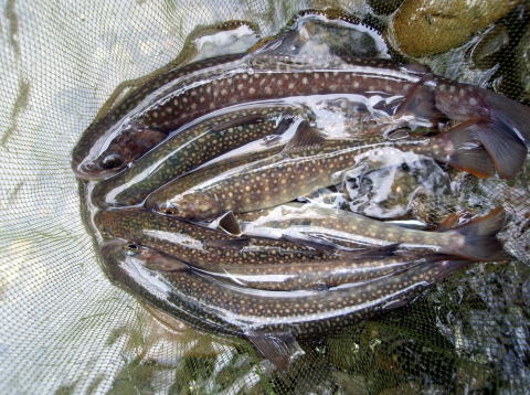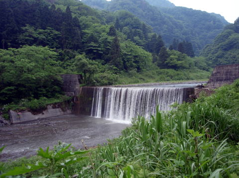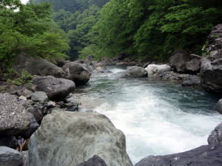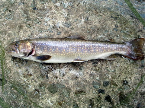 | その後、直ぐ下のポイントで良型のイワナを2匹釣り上げたところで、つかさくんの様子を見に下流へ移動した。 つかさくんのタモには2匹のイワナちゃんが泳いでいたが、どうやら大物を釣り上げたのだが、入れておいたタモから逃げられたようでガックリと肩を落とし戦意喪失していたところであった。 だが、私が先ほど釣った尺物を見せると、一緒になって喜んでくれた。 つかさくんの釣っていたポイントは前回のGWでも釣れたようで、今回もよくアタリがたくさんあるようで、私も竿を出したが、もう十分につかさくんが攻めきったようで、ここで生かし魚篭のイワナ達を流れに戻し、再び上流の堰堤へ戻った。 すでに濁りはとれているが、水量が多く水飛沫が凄い。とても落込みの前には立てないので両脇に分かれて竿を出した。つかさくんが右側から竿を出し、良型を3匹程釣り上げたが、無理して渡った左側の私には残念ながらアタリが無かった。 でも、十分に満足できたので、ここで引き上げることにした。 |