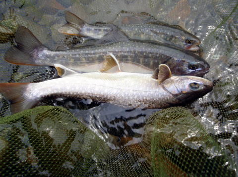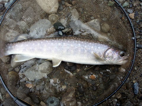 | 下流のポイントでは、だいたい釣り座が決まっている。二人で来た時はつかさくんが上流、私がその下で竿を出すのだ。 だが、今回はつかさくんが下流で竿を出すというので、いつもつかさくんが釣っているポイントに向かった。 ここでは全く濁りも無く、期待が出来そうだ。そして、その第一投目、いきなりググンと仕掛けが持って行かれた。 流芯へと引きこまれたが、幸い一気に下られなかったので、竿を立てて持ち堪え流れの緩い場所へと誘導し、しっかりとタモに収めることができた。いつもの泣き尺かと思うサイズであったが、かろうじて30cmを越えており、思わずニンマリとした。 |