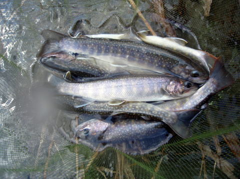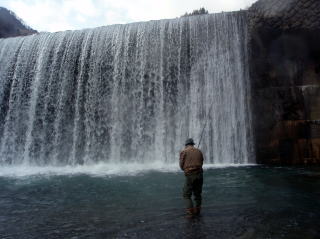 | この後、増水した川を恐る恐る渡り、支流の堰堤を狙ってみた。 やはり支流も雪代の影響で水量が多く、いつも釣れるポイントは白泡で爆発状態だった。 だが、増水で流れ出しがいい具合に緩やかな流れになっている。ここには絶対に良型のイワナがいるはずだ。 狙いを澄ませて第一投目、目印が止まった。来た・・・、空かさず合わせた、バレた。 やってもうた。(;_;) 第二投目、今度はなんとか釣り上げた、いい型だ。 第三投目、今度もなんとか釣り上げた、いい型だ。もう十分だ。 遅ちゃんに交代した。 第一投目、目印が止まった、空かさず合わせた。 根掛りだった。 仕掛けが切れた。 終了だわな。(;_;) じゃあわてが、もう一回やってみるか。 第一投目、目印が止まった、空かさず合わせた。やっぱりバレました。 初釣りとしては十分に満足した隊員達は釣り上げたイワナ達を上流の堰堤まで運んで放流し、青海を終了した。 後半へ続く。 |