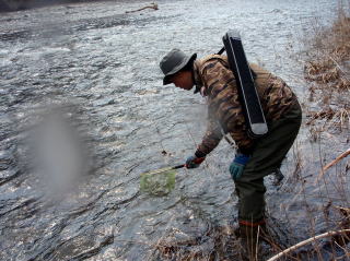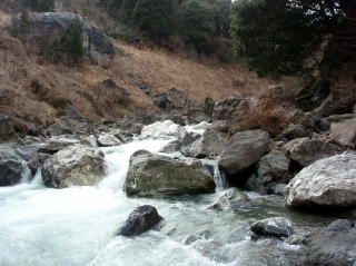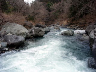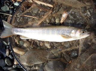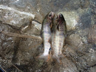| しばらくそれぞれに釣りの時間を楽しんだ。 遅ちゃんは上流の堰堤で粘っていたようで、日が昇ってきて水温も少し上がったらアタリが出だしたようで良型のイワナが3匹釣れたと言ってニコニコしていた。 再び下流へ移動した。ここは昨年のGWに良型を連発したポイントである。だが増水の為、釣り難いことこの上無い。 私は塩焼きサイズを一匹釣るのが精一杯であった。遅ちゃんは小物を2匹程釣り上げて再びニコニコしていたが、つかさくんは自分の足元で一匹釣れたが、バレたようだった。 |