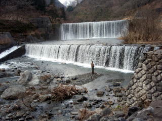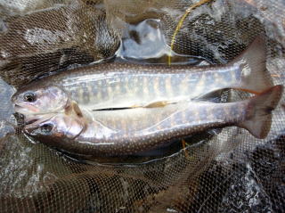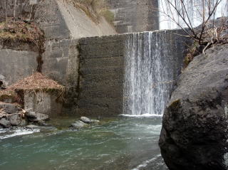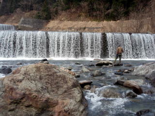 | 下流の小堰堤では、つかさくんが粘り強くポツポツとイワナを釣り上げていた。 この小堰堤の落込みは、水深も浅く障害物も多いので自分には苦手なポイントであるが、つかさくんを見ると軽く流しながら見事にポイントに仕掛けを入れており、粘り強い釣り方である。 どちらかというと、自分は大錘を使って深い淵の底にいる大イワナを釣るのが好きなのです。 見よう見真似で何とか一匹は釣れたのだが、やはり根掛りをして仕掛けを失ってしまった。 そういえば、以前「しんくん」もこのポイントが得意なようで、何匹も釣り上げていた事を思い出した。 |