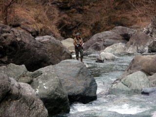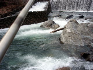 | やはり雪代の影響で水温が低くて喰いが渋い。白泡の中や流れ出しでもアタリが無い。 脇の流れが緩いポイントを何回か流すとやっと今年最初のイワナが顔を見せてくれた。 つかさくんは、水飛沫に耐え切れずに下のポイントへ移動していたが、振り向くと丁度一匹釣り上げたところだったが、バレたようだった。その後もしばらく粘ったがアタリも無いので下流へ移動した。 |