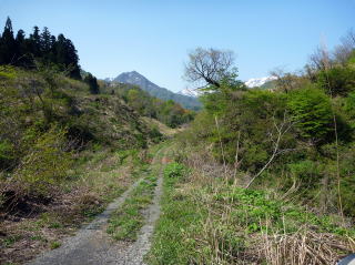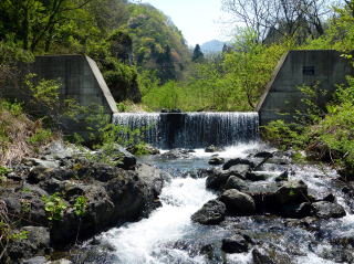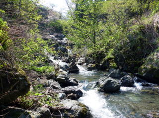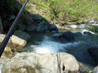 | 地図上では山道があるので探してみると、何と車も通れる広さであったが、ゲートがあってしっかりと施錠されていた。 2km程歩けば支流と合流できるはずなので、バカ話をしながらゆるやかな坂道を歩いて行った。 そして30分ほどで予定通りに支流が現れた。 思った通りだ、以前はこの下流まで釣り上がったのだが、巨岩と滝で遡行を阻まれて引き返した箇所の上流に出ることが出来たのだ。 渓流マンとしては、やはり初めての川はワクワクします。どんなポイントが現れるのか、はたして大物は釣れるのか、期待に胸を膨らませた。 |