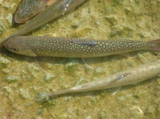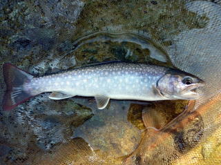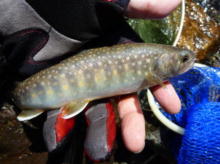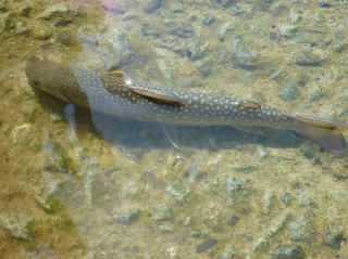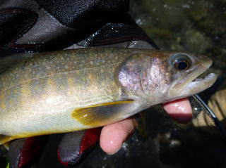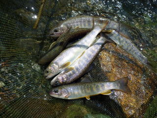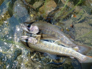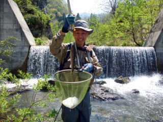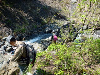 | 最初は集合時間を決め、入渓地点の橋の前後をそれぞれに竿を出すことにした。 30分程竿を出したが、釣れてくるのは20センチ前後で大物が出ることは無かったので、上流を目指して交代で竿を出すことにした。 そして、先行していた私をつかさくんが慌てて呼びにきたので何事かと思ったら、遅ちゃんが大物と格闘していた。 高台から釣っていたので取り込みが出来ないようだったので、私がタモに収めて上げた。 泣き尺サイズであったが良型のイワナで、遅ちゃんニッコリ。もちろん遅ちゃんは帰路に着くまでの間、このポイントから二度と離れることは無かった。 |