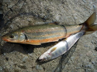 | 車に戻った後、隣の「田海川(とみかわ)」を覗いて見たが、あまり興味をそそられることも無かったので、「境川」へと向かった。 水量は少し多目であったが、雪代の濁りも無いので竿を出してみることにした。 『昼飯前にちょっと竿を出そまいか。』と遅ちゃんに言おうと思ったら、既に河原に降りていた。 やる気マンマンかと思いきや、タモも持たずに、靴はズック。 なめているとしか思えんがや。 そんな遅ちゃんを横目に釣り始めると、私にすぐにアタリがきてイワナが釣れた。だが、運悪くハリ飲み込まれてしまったので外していると、後ろから何やら声が聞こえた。 振り返ると、遅ちゃんの竿が大きくしなっており、大物が掛ったようだ。タモを持っていない遅ちゃんが私を呼んでいたのだ。 しかたなく近寄ってみると獲物はやはり遅ちゃんのお友達で、しかも尺上サイズだ。私はいやいやながら、まだハリが付いたままのイワナが入ったタモにお友達を救い上げてあげた。 タモのお友達を遅ちゃんに見せると、今度はハリを外してくれと言わんばかりに顎で合図をしている。今日二回目のタモマンになってしまった。 だがこの直後、私に良型のイワナが掛り、今度は遅ちゃんにタモを渡して取り込んで貰った。 遅ちゃんにはやはりお友達が顔を見せていた。 |