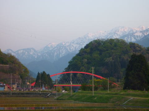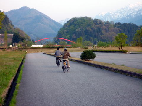 | 急な下り坂を一気に駆け下り、キャンプ場横の支流を探索。 以前、竿を出したことのあるポイントまできたが、竿を持ってくればよかったなあと思うほどいいポイントも点在していた。 戻る途中では、つかさくんが「カブ」に乗ったおっさんと出会い、危うく正面衝突しそうになり急ブレーキを掛けるハプニングもあった。 この後、黒部川の河川敷にある「墓の木公園」のサイクリングコースへ行き、立山連峰の雄大な眺めを満喫しながら、のんびりとした時間を楽しんだ。 だが、『明日キャンプ場』はかなり高台にあり、帰りのことまで深く考えていなかったので、帰りの坂道は全員ヘロヘロ状態。 最後は全員自転車を降りて、引きながら何とか辿り着く始末でした。 |