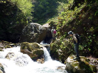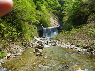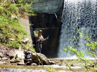 | 巨岩がゆく手を阻んでいるので、今度は右から高巻きをして乗り越え上流へ出た。 すると今度は二段堰堤が待ち構えていた。ますます期待に胸が弾む。 途中のポイントには目もくれずに、堰堤へと突き進んだ。そして最初に私が竿を出してみた。 水飛沫で、服もびしょ濡れ状態になるまで粘ったが、結局イワナの顔を見ることは出来なかった。遅ちゃんもすぐに諦めたようだ。 この2段堰堤を越えるルートを確認し、ここで引き返すことにしたのであった。 |
