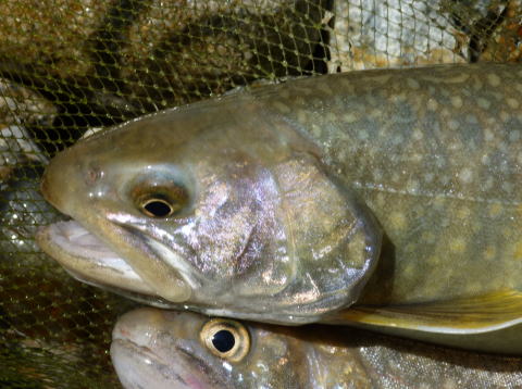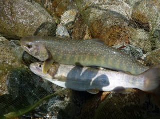 | 最初に、遅ちゃんが堰堤より少し下の落込みで竿を出し、直ぐに小振りのイワナを釣り上げたが、例の如く私がタモで救い上げてあげると元気に流れの中に帰って行かれました。 堰堤の落込みで竿を出したつかさくんが「釣れたよ〜」と釣り上げたイワナをこちらに見せている。 先客がいたかは判らないが、エサの「ギンパク」も効いたのかも知れない。 そしてつかさくんは、直ぐに2匹目も釣り上げ、ウハウハと胸を叩いて喜んでいたのであった。 |